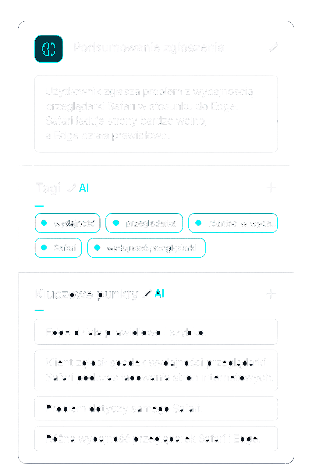 Wbudowany moduł AI skraca czas reakcji i odciąża zespół: generuje podsumowania, sugeruje odpowiedzi, wspiera onboarding. Wszystko działa w Twojej infrastrukturze, zgodnie z polityką bezpieczeństwa i bez wysyłania danych na zewnątrz.